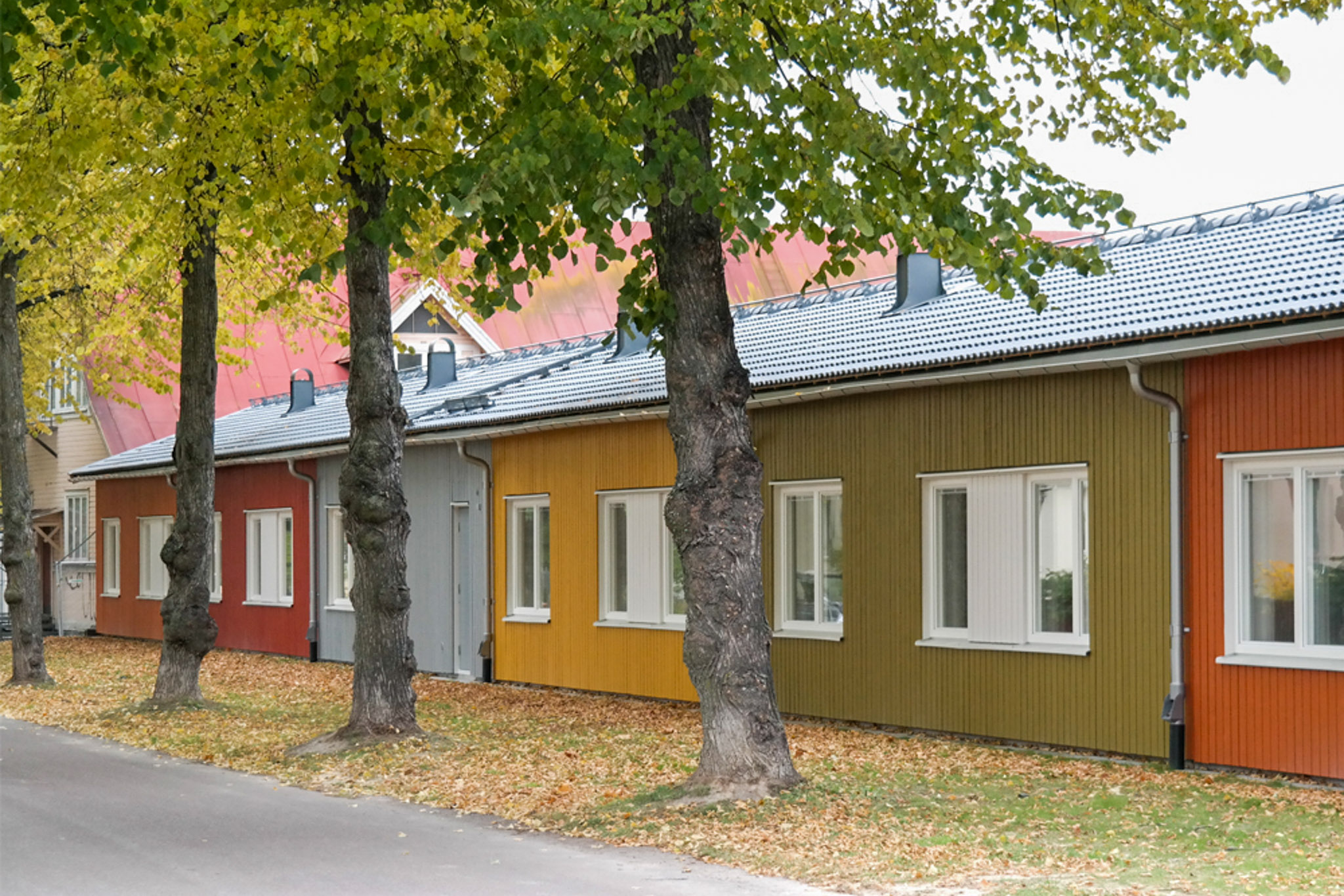 Den gamla baracklängan från 1949 revs och ersattes av en ny radhuslänga med småskalig känsla i relation till skolbyggnaden och gymnastiksalen.