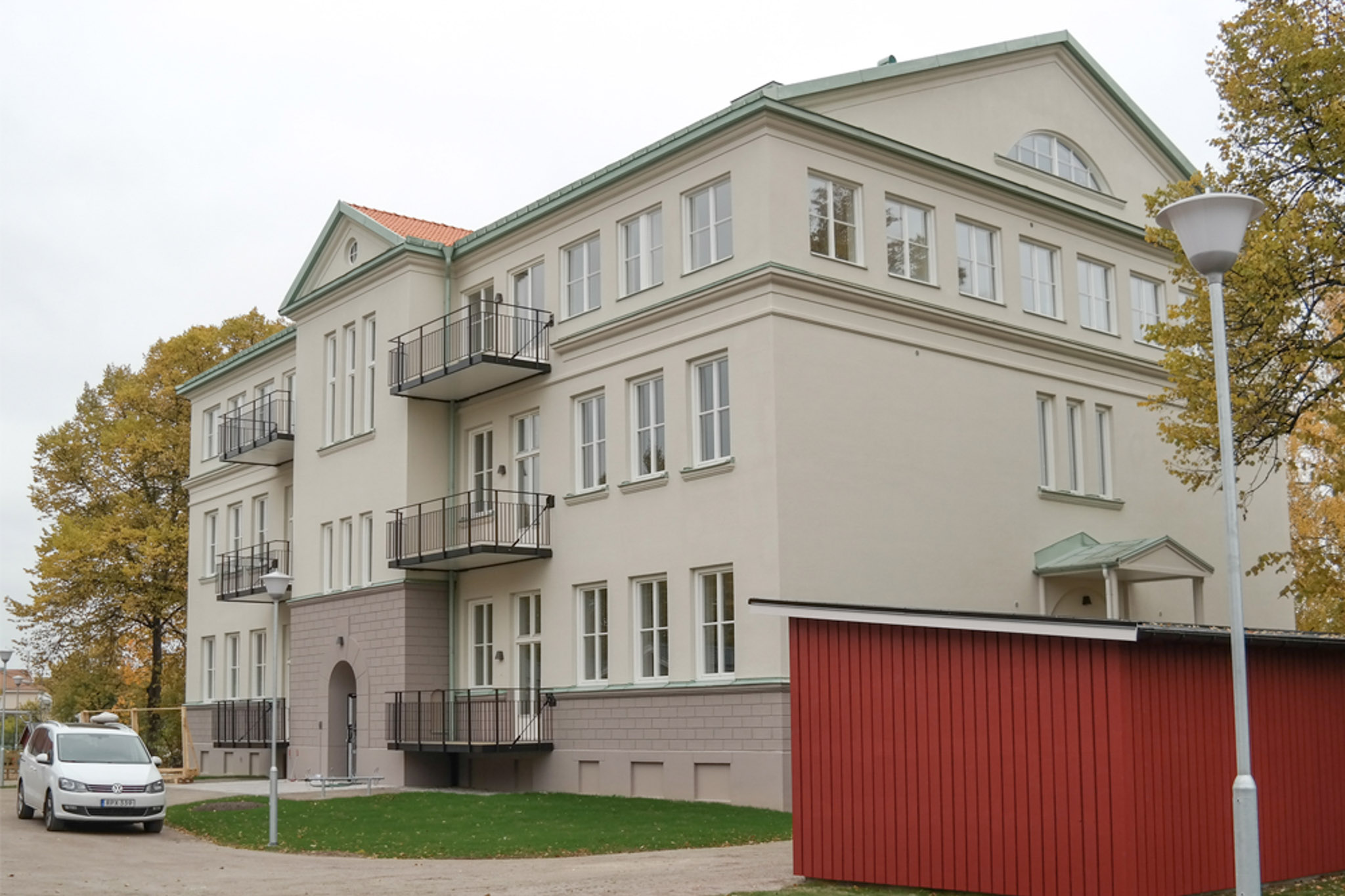 Den gamla klassiska huvudbyggnaden från 1914 byggdes om till 14 lägenheter i varierande storlekar. Ingen lägenhet är den andra helt lik.