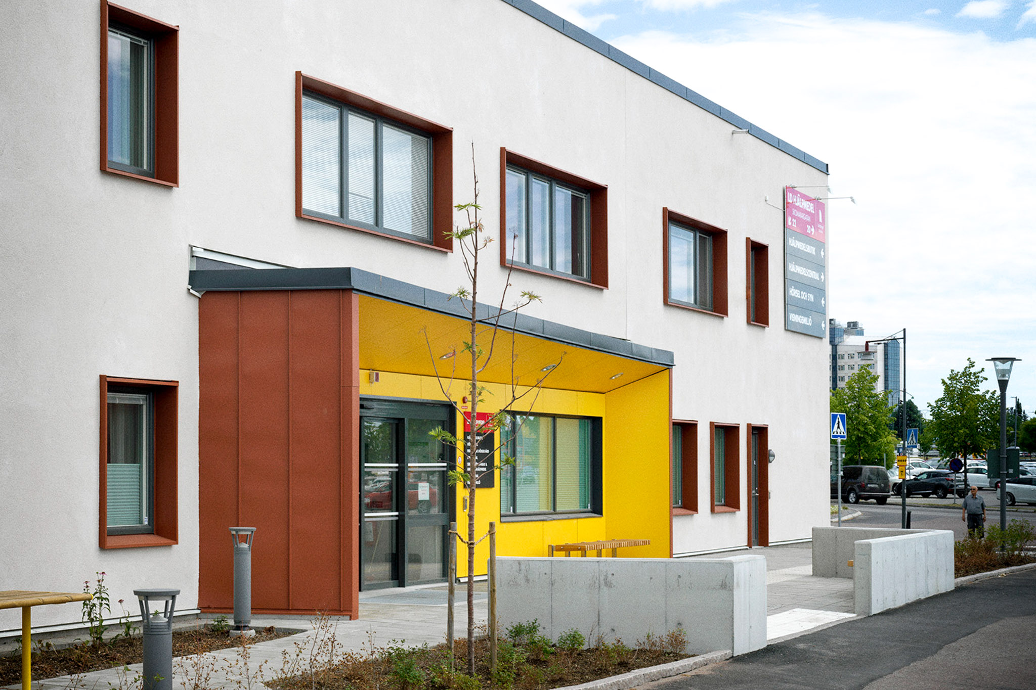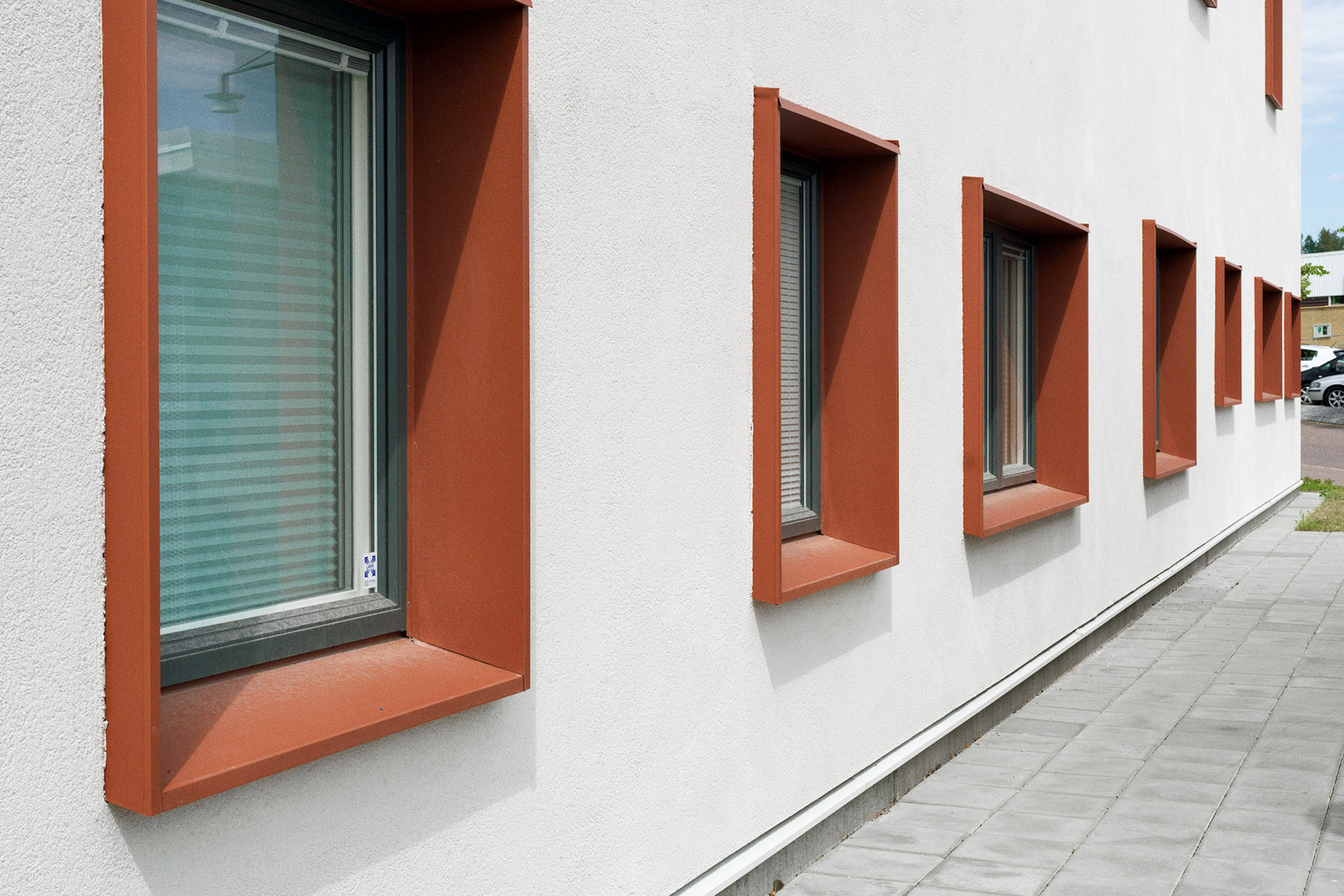 Ombyggnaden innebar att allt utom stommen revs. Pelare förlängdes och taket lyftes två meter för att ytterligare en våning skulle rymmas. För att få in ljus i den djupa byggnaden ritades en lanternin över butiksdelen som är öppen i två plan. Byggnaden är putsad och fönster och huvudentré markeras med plåtramar för att ge fasaden dynamik.