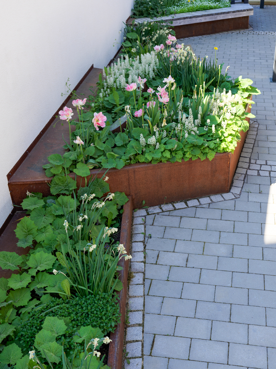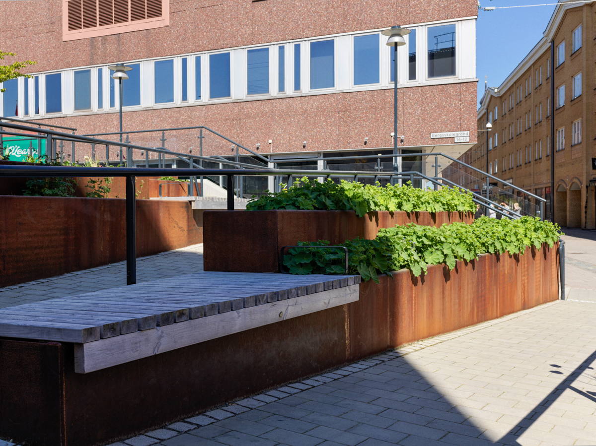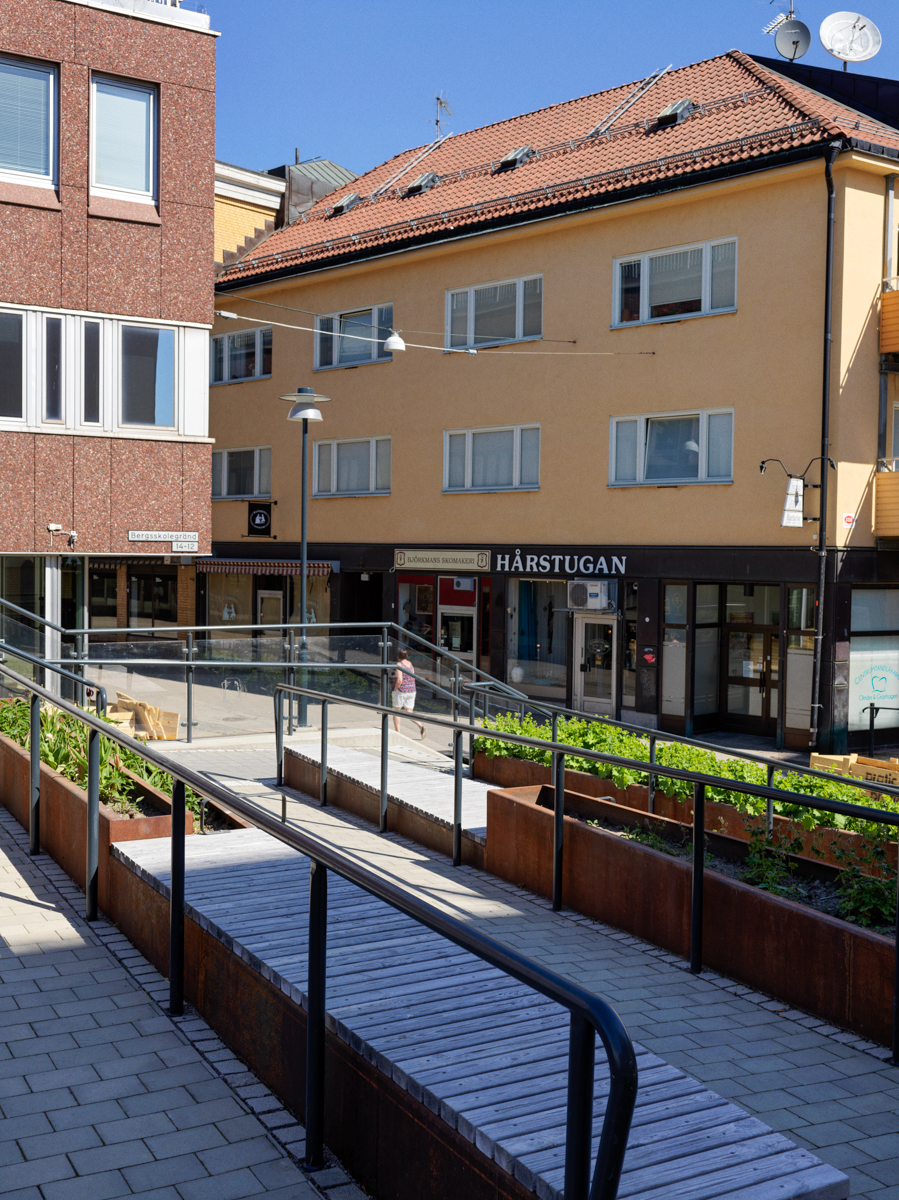 Resultatet av utredningen blev en terrass och park som kom att gå under namnet Lydias terrass. Svåra höjdförhållanden och krav på tillgänglighet gav en intrikat lösning där trappor, ramper, planteringslådor och sittytor vävdes ihop till en intressant och inbjudande liten oas mitt i centrum. Med sin placering någon meter över gågatorna skapades en avskild lugn yta perfekt att inta sin lunch då vädret tillåter.