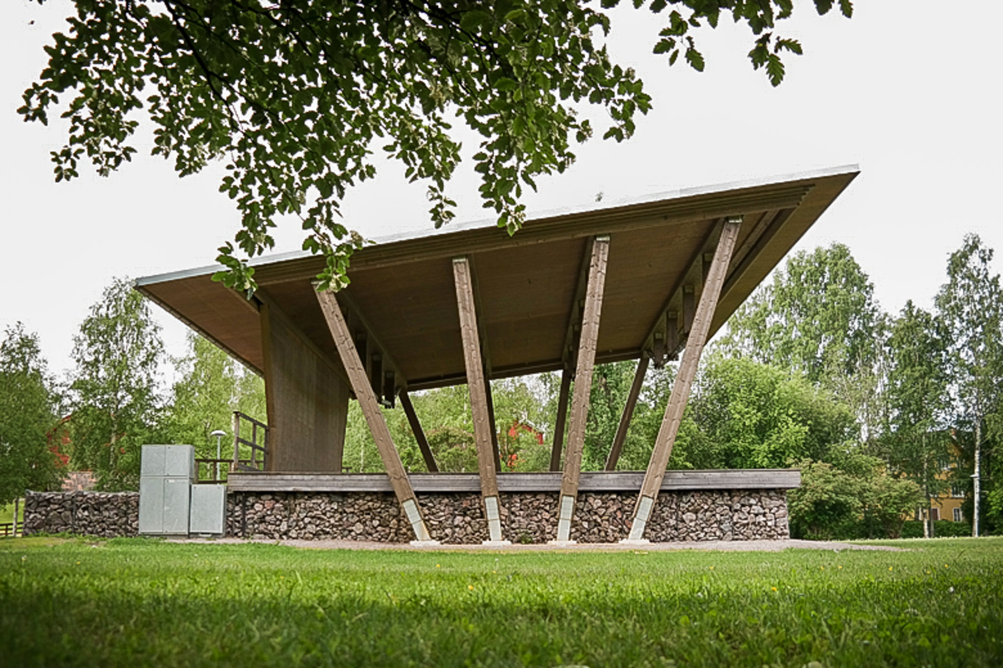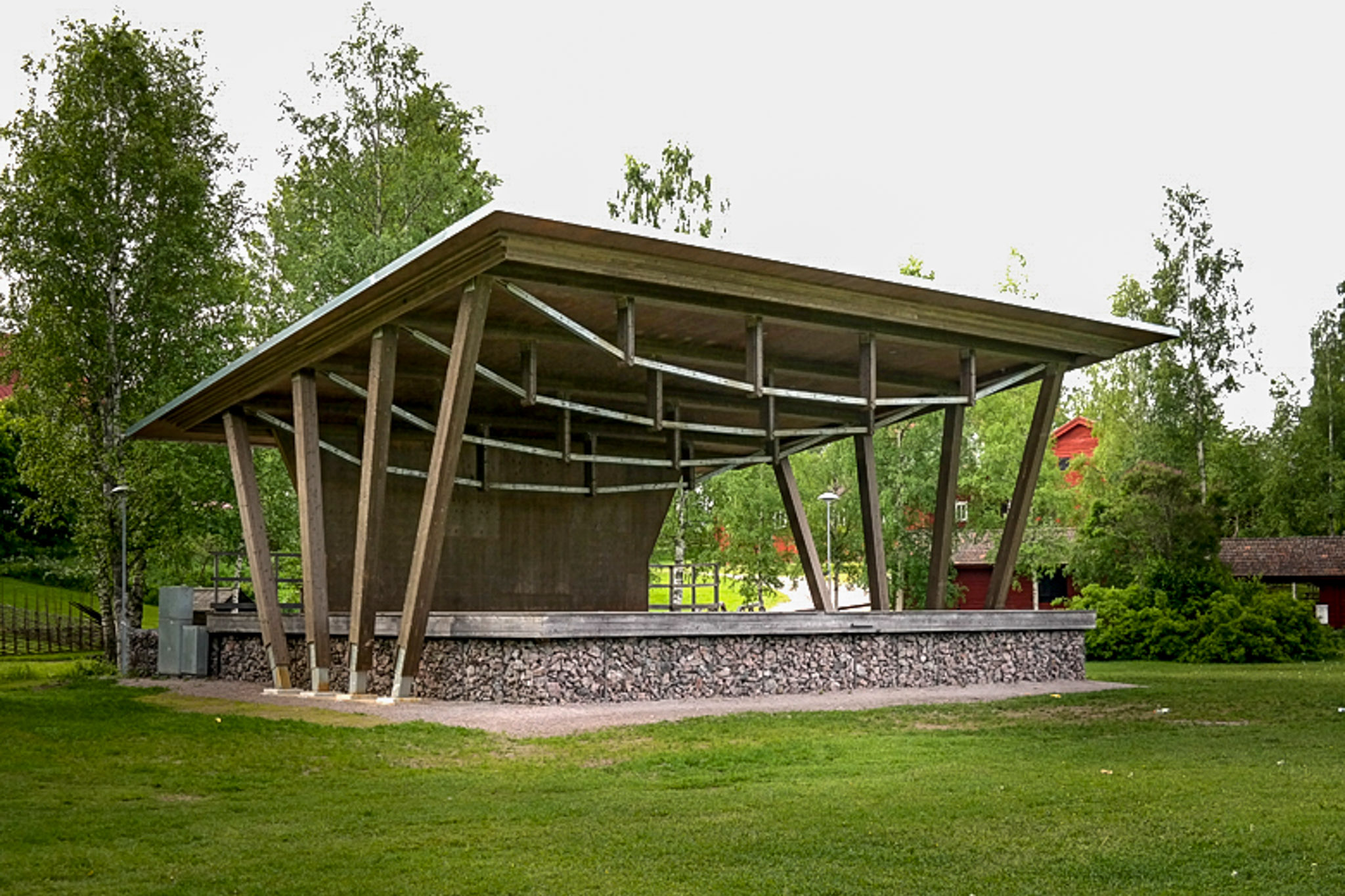Nybyggnad av tak över befintlig scenkonstruktion med sidor av sprängstenfyllda gabionburar. Taket är utfört av limträpelare, limträbalkar, massivträelement, smidesdetaljer samt kompletteringar av lösvirke. Alla träytor är behandlade med järnvitriol för att få en grå patina som anknyter till hembygdsgården Mårtens intilliggande byggnader.