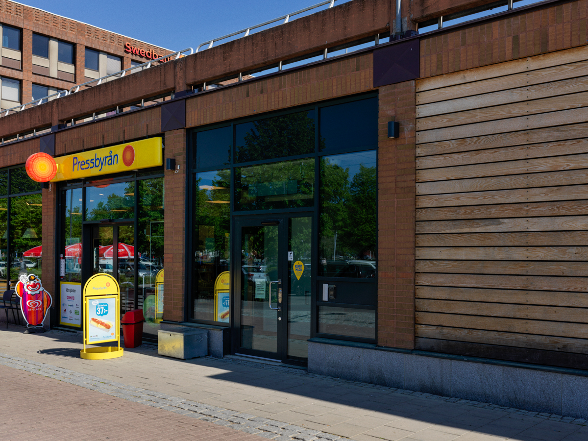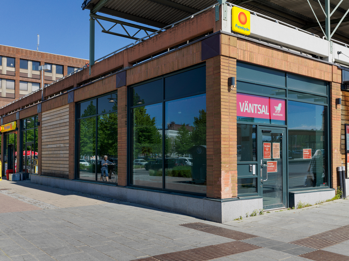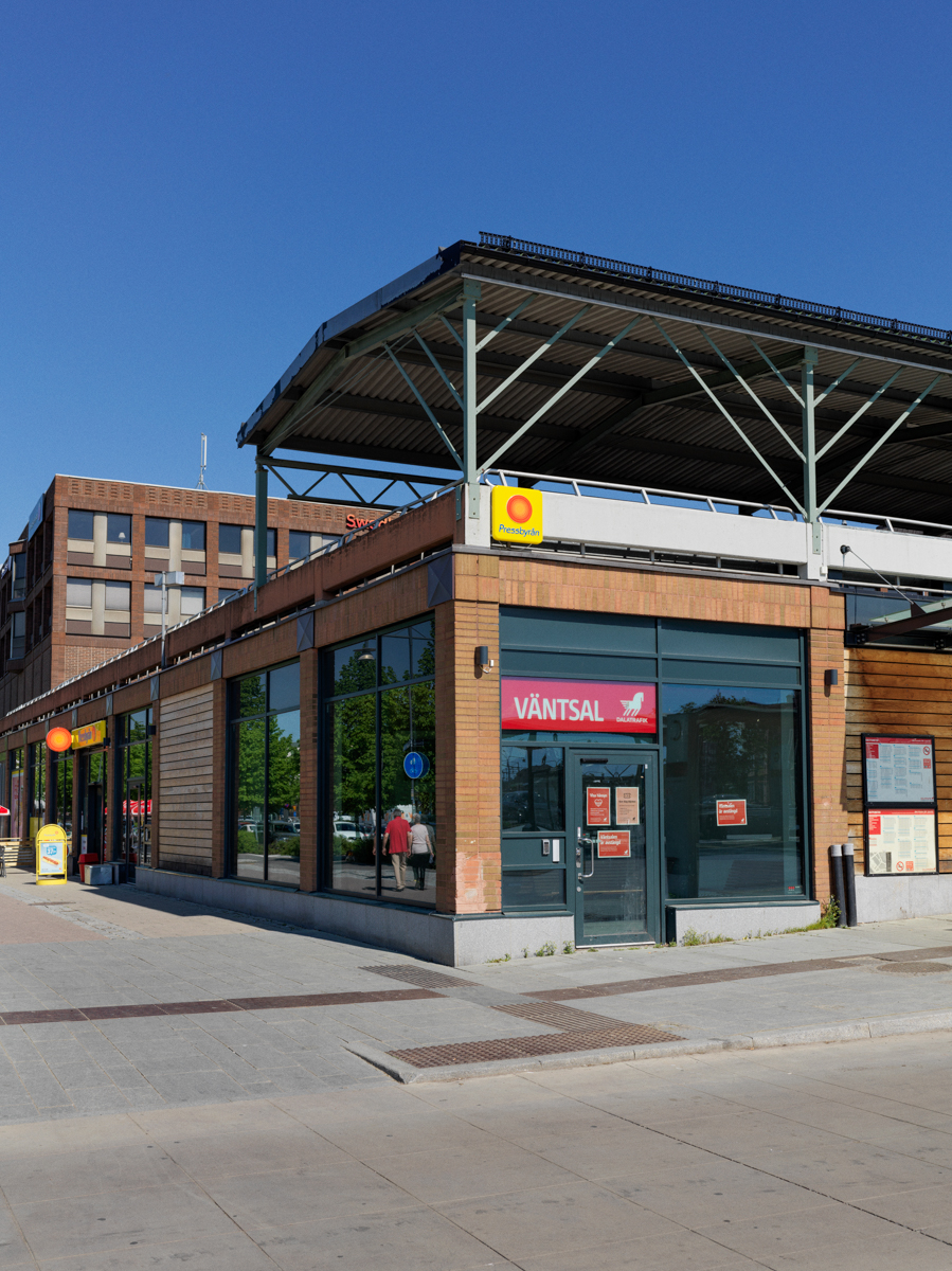 Fastighetsägaren Diös ville dra nytta av detta utrymme, aktivera fasaden och på så sätt även levandegöra denna del av torget. Hörnet närmast knutpunkten blev till en väntsal för bussresenärer och på andra sidan inrymdes en Pressbyråbutik. Mellan lokalerna finns en ny koppling till parkeringsgaraget där även en nivåskillnad hanterades med trappa.