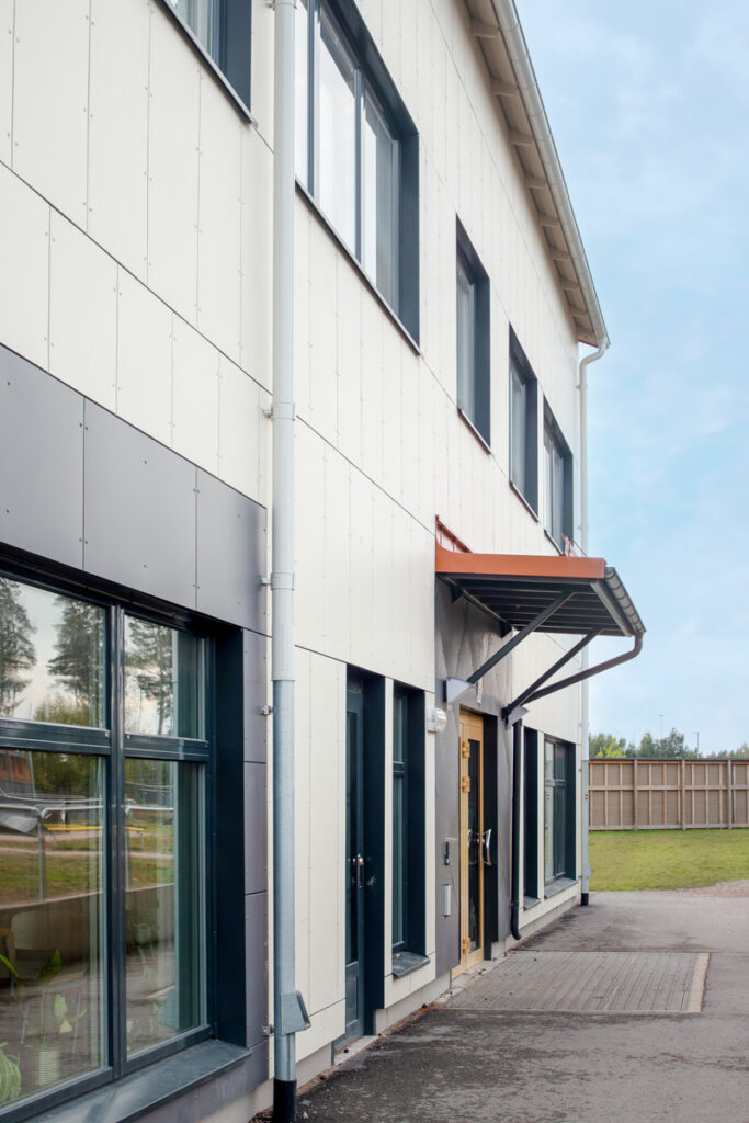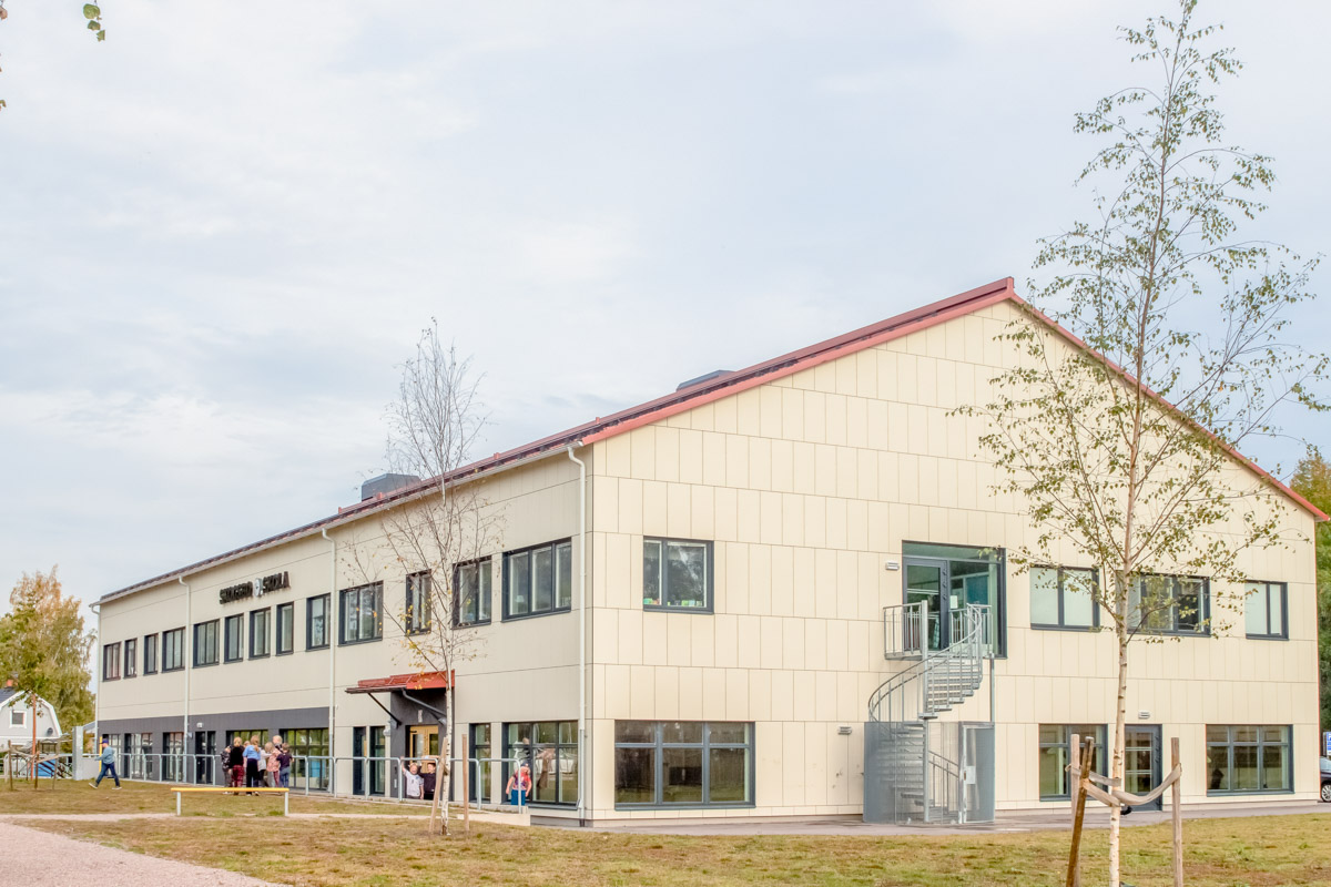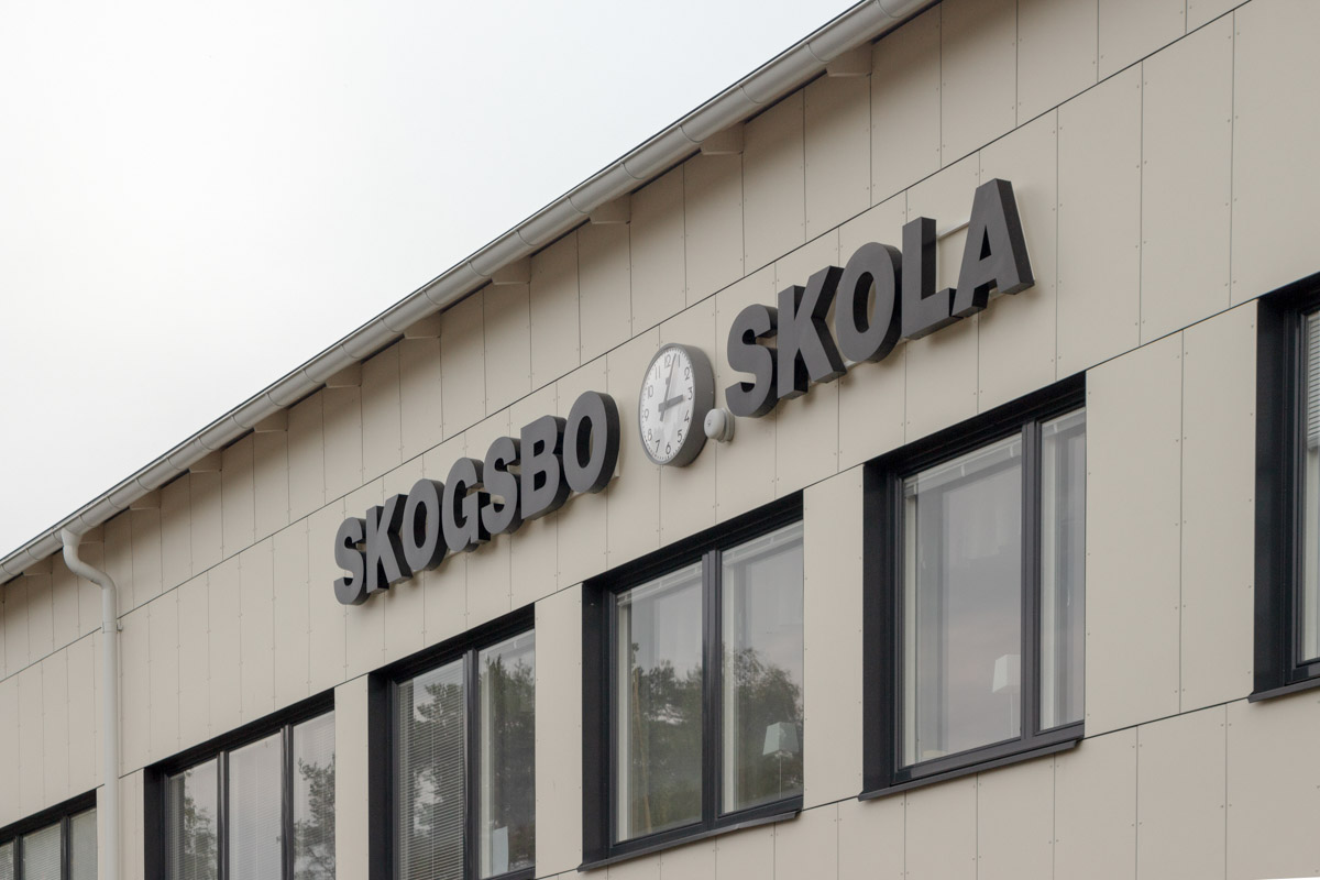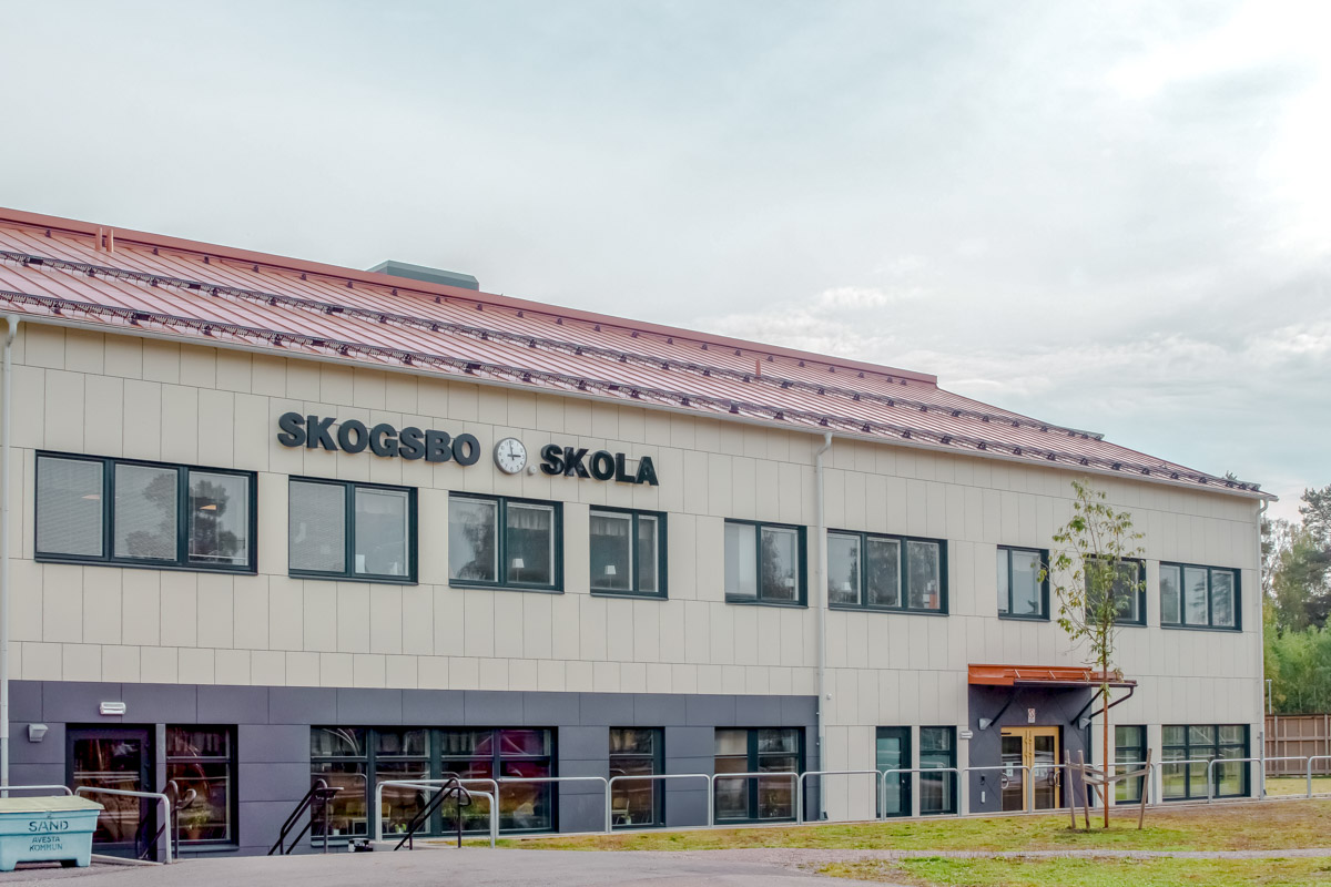 Skogsbo skola är en ny byggnad på ett befintligt skolområde, med 8 st klassrum samt kök och matsal.