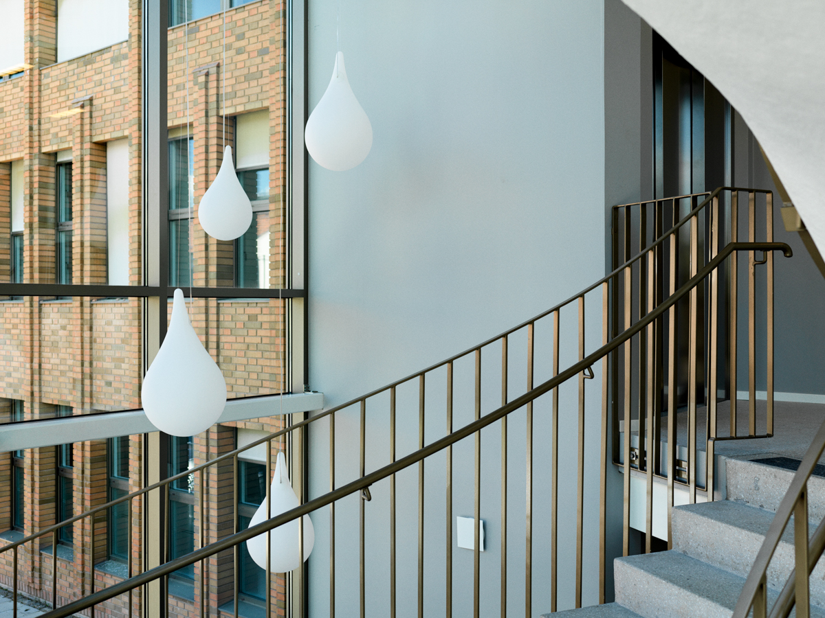 I uppdraget ingick även att föreslå och illustrera en dekorativ belysning att pendla ner i det höga trapphusrummet.