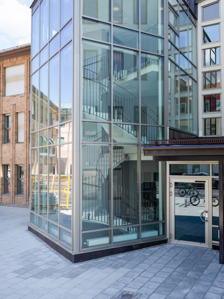 Utmaningar fanns i placeringen och gestaltningen av trapphuset. En befintlig entré i markplanet samt en intilliggande inlastning gav viss styrning och vissa ramar angående placeringen. På den angivna platsen för trapphuset möts tre olika formspråk; byggnadens avskalade högdel i vit puts och mörkt bruna partier, en lägre tegelbyggnad med bearbetade detaljer och rejäl takfot, samt en kopplingsdel med glasfasad och välv tak. Det nya trapphuset är glasat och inbjudande och genom att snedställa två av fasaderna så öppnar det upp sig mot besökarna. De bronstonade aluminiumpartierna ansluter fint mot tegelbyggnadens fönster och glasfasadens hämtar rytm och proportioner från intilliggande fasader.